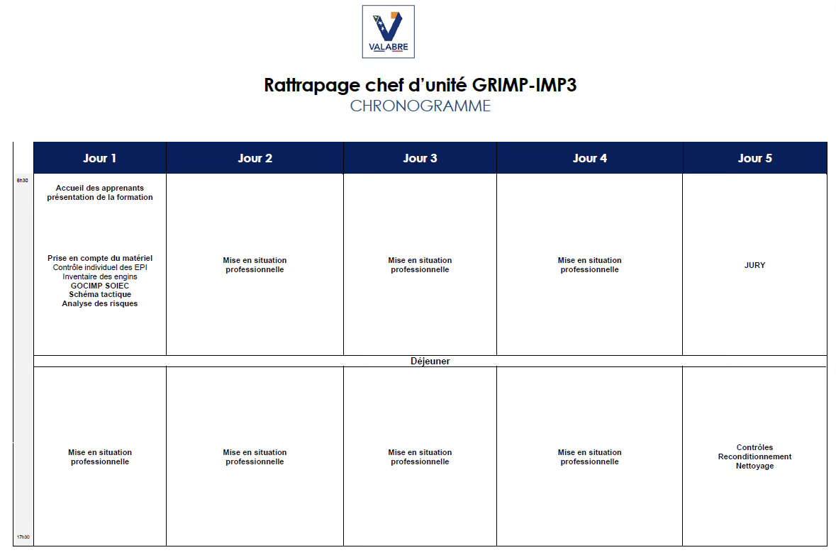 - Disposer d’un plan d’action formalisé par le CNF GRIMP et validé par le service formation du SIS