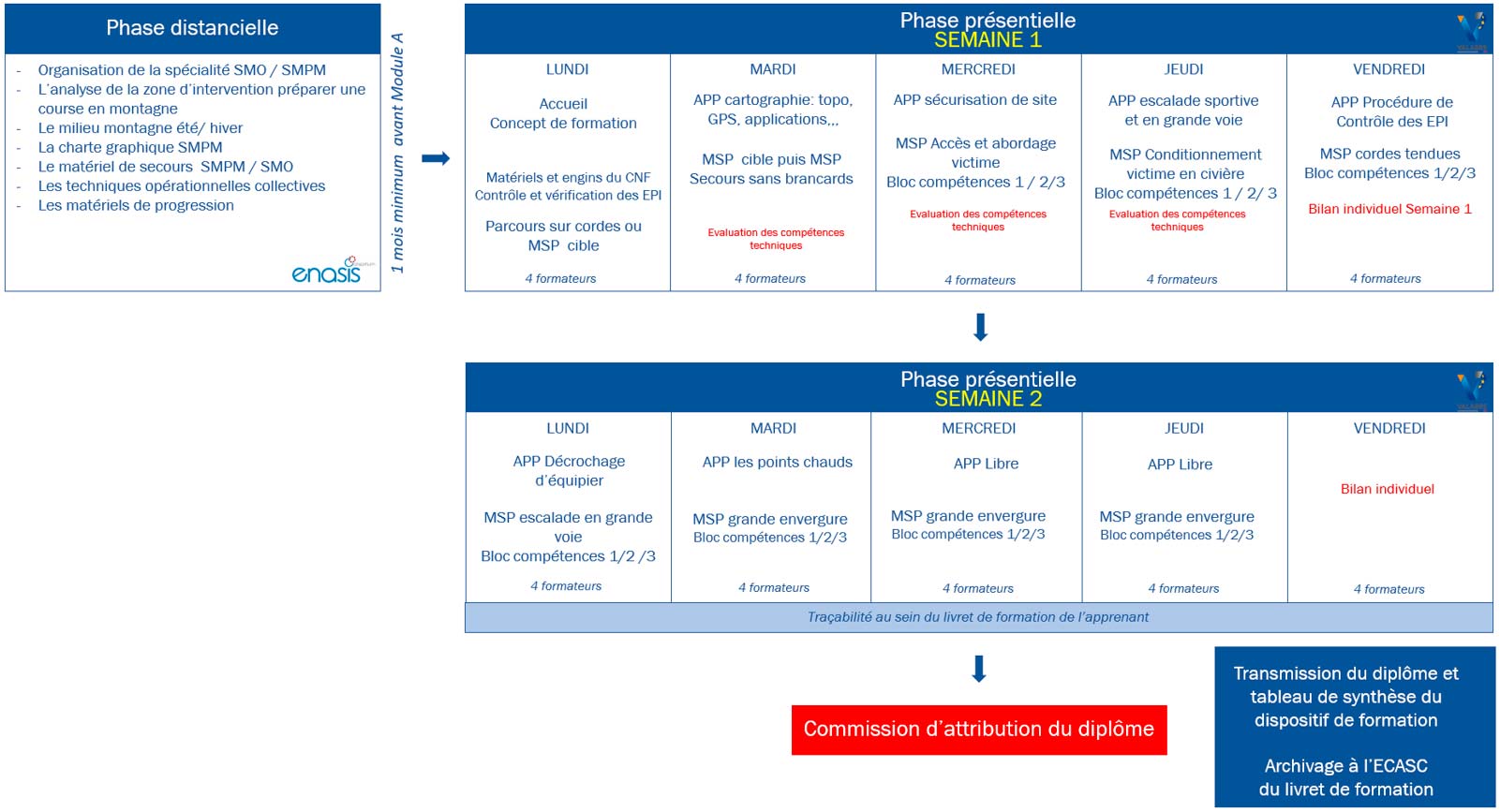- Une évaluation pratique formative portant sur l’acquisition des compétences associées aux blocs de compétences « Intervenir seul ou en binôme pour une mission de sauvetage en qualité d’équipier secours en montagne» et « Intervenir en équipe constituée pour une mission de secours en montagne »